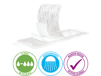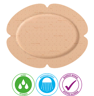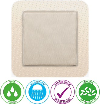 Opatrunek z 5 warstw do ran z duzym wysiekiem z cechami infekcji. Wodoodporny. Dobrze przylega do skóry wokół rany.
